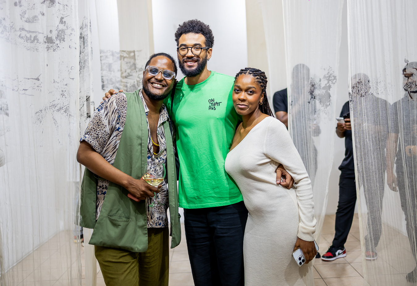 Daniel de Lemos, Toty Sa'Med e Nayela durante a exposição As Camadas da Alma, MIA 2025, em Luanda | Foto BANTUMEN