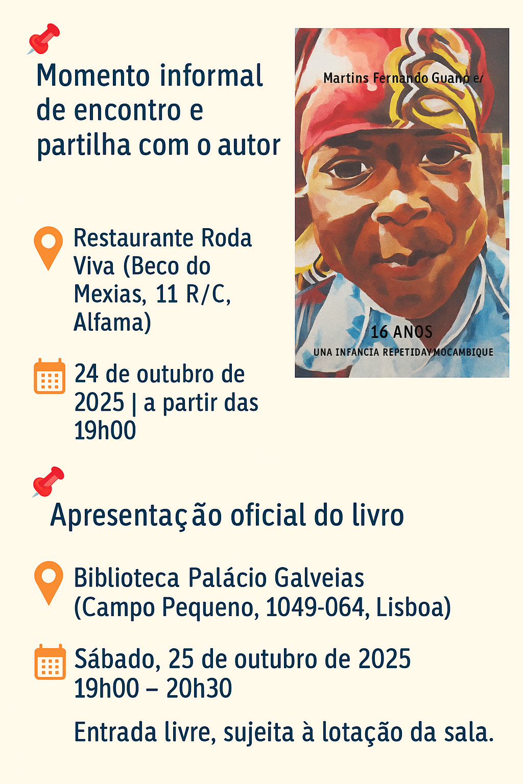 O escritor Martins Fernando Guambe apresenta, no próximo sábado, 25 de outubro de 2025, o seu mais recente romance, “16 anos, uma infância repetida, Moçambique”. O lançamento decorrerá na Biblioteca Palácio Galveias, em Lisboa, entre as 19h00 e as 20h30, e promete ser um encontro de celebração da literatura moçambicana contemporânea.