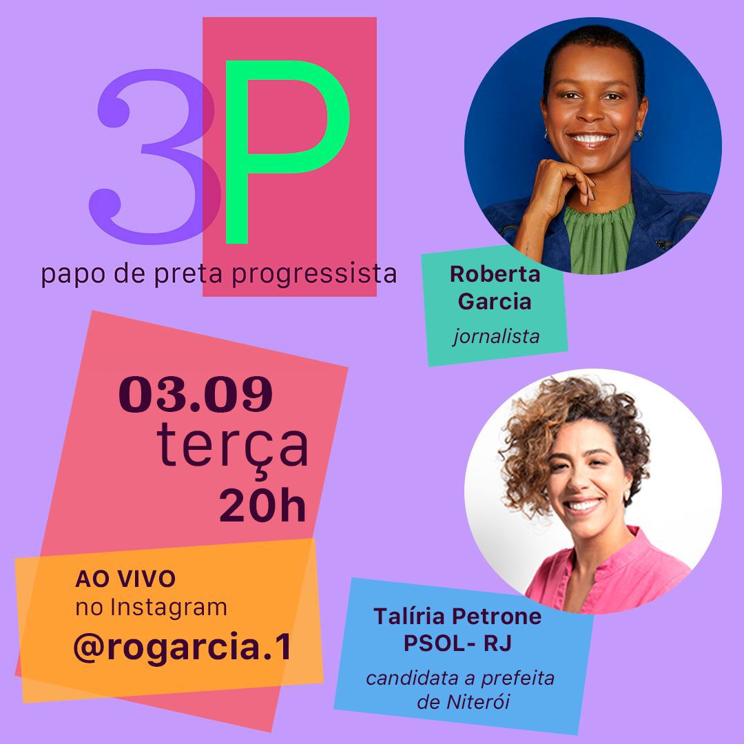 Nesta terça, às 20h, a jornalista Roberta Garcia irá receber a candidata Talíria Petrone no programa Papo de Preta Progressista (3P). Deputada federal pelo PSOL, Talíria está concorrendo à prefeitura de Niterói, no Rio de Janeiro.