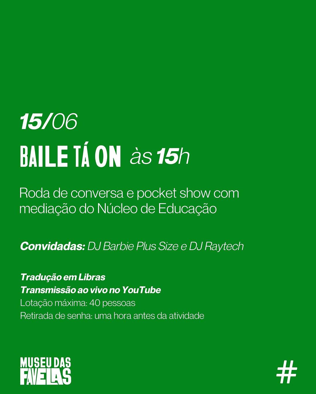 O evento "Baile tá ON!" será em 15 de junho, às 15h, na Sala "Visão Periférica". Nesta edição, o projeto se inspira nas favelas e quebradas do Pará, apresentando DJ Raytech e Barbie Plus Size como convidadas especiais. O evento – limitado a 40 pessoas – inclui roda de conversa, pocket show, tradução em Libras e transmissão ao vivo no canal do YouTube do Museu das Favelas. As senhas para participar serão distribuídas uma hora antes da atividade.