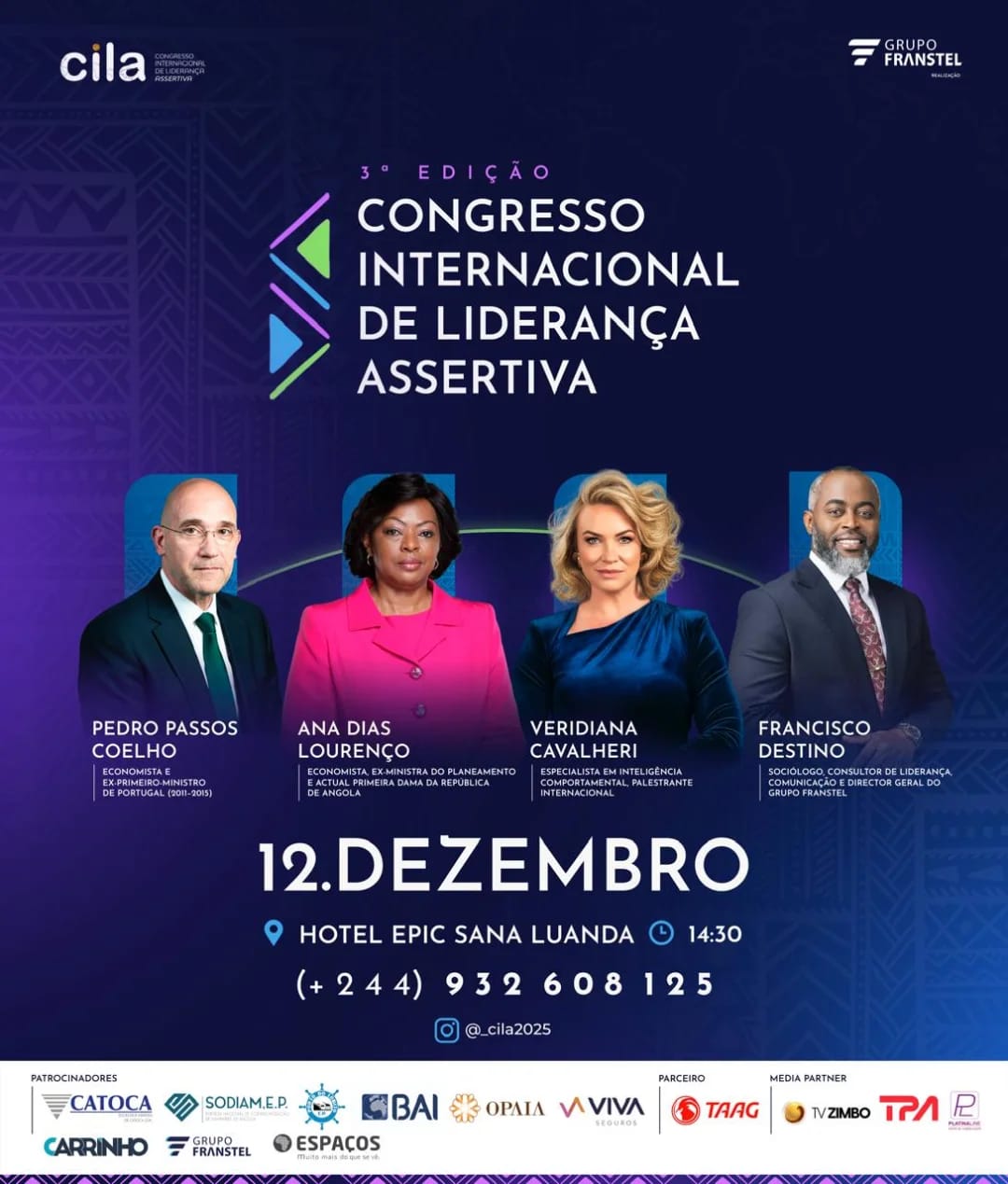 No dia 12 de dezembro, às 14h30, o Hotel Epic Sana, Luanda, recebe o Congresso Internacional de Liderança Assertiva. A programação centra-se em métodos de tomada de decisão, comunicação estratégica e modelos contemporâneos de atuação profissional.