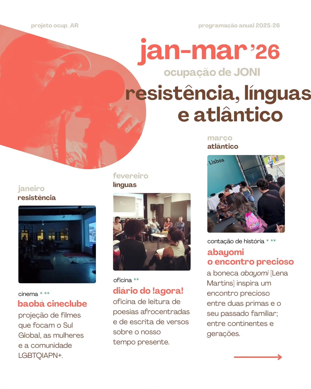 A Casa Capitão acolhe a exposição Resistência, Línguas e Atlântico, do artista visual Joni Riccos, de 20 de janeiro a 20 de março, integrada no Projeto Ocup_AR, que desenvolve uma programação contínua de Educação para os Direitos Humanos. A mostra inaugura um processo expositivo em transformação, atualizado ao longo do trimestre, acompanhando os temas e aprendizagens coletivas do projeto.