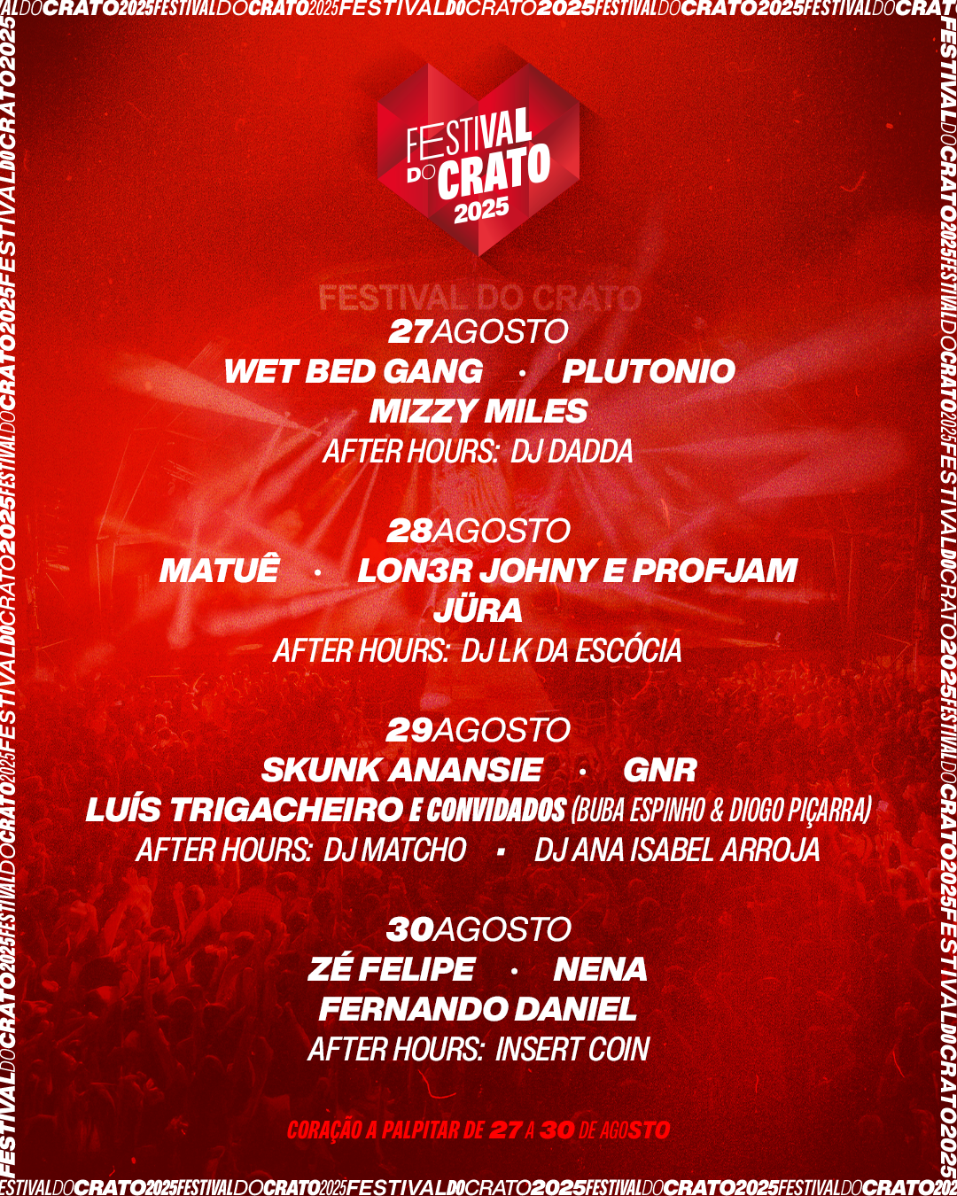 De 27 a 30 de agosto, o coração do Alto Alentejo volta a pulsar com o Festival do Crato 2025. São quatro dias de música ao vivo, festa e diversidade sonora que cruzam o hip hop, pop, rock e electrónica, numa edição que promete atrair milhares de pessoas à vila alentejana.
