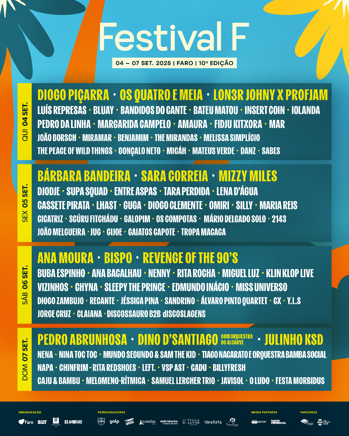 De 4 a 7 de setembro de 2025, Faro transforma-se novamente na capital da música portuguesa com a 10.ª edição do Festival F. Este ano, a celebração faz-se em quatro dias, nove palcos e cerca de 100 atuações que percorrem todo o espectro da música nacional, da tradição à vanguarda.