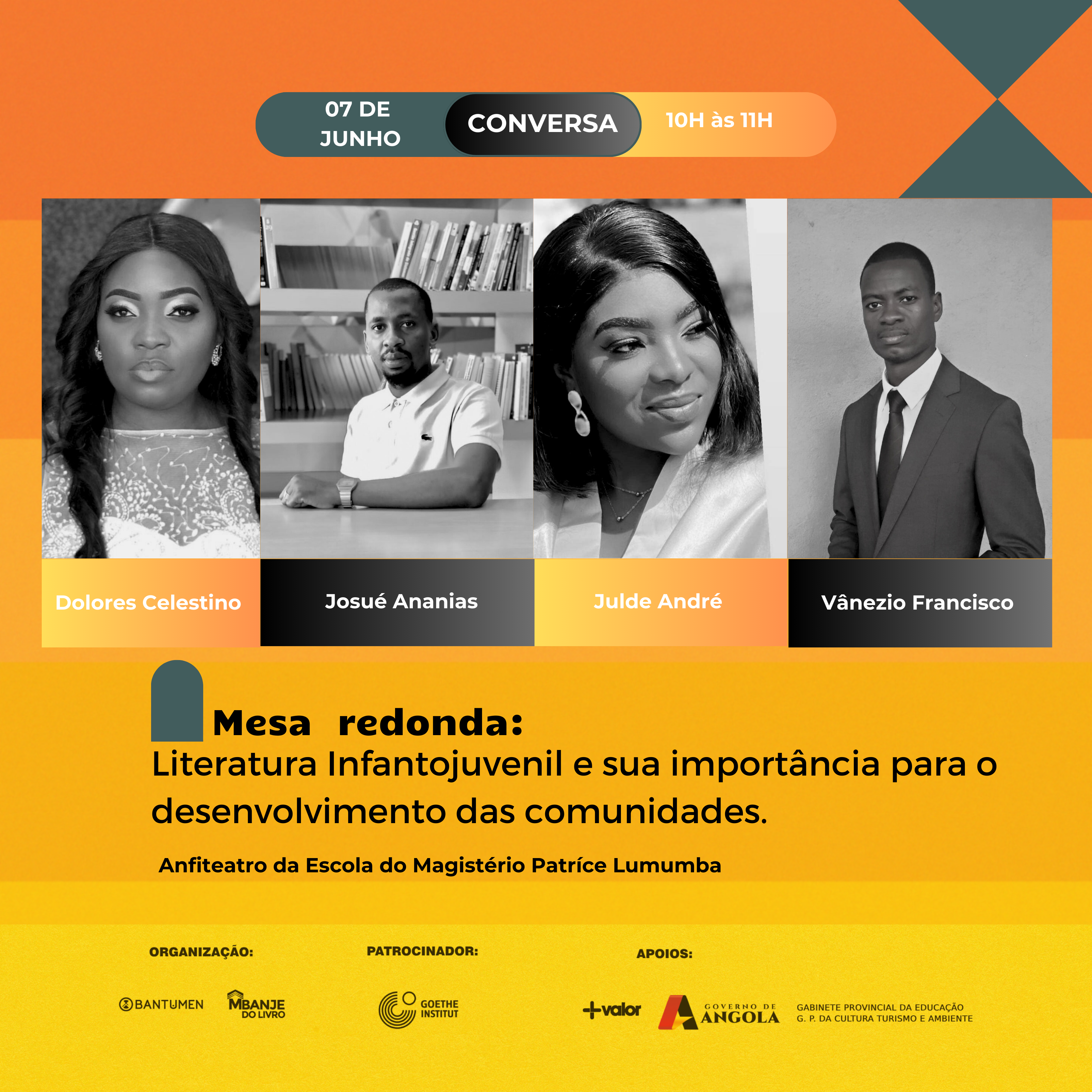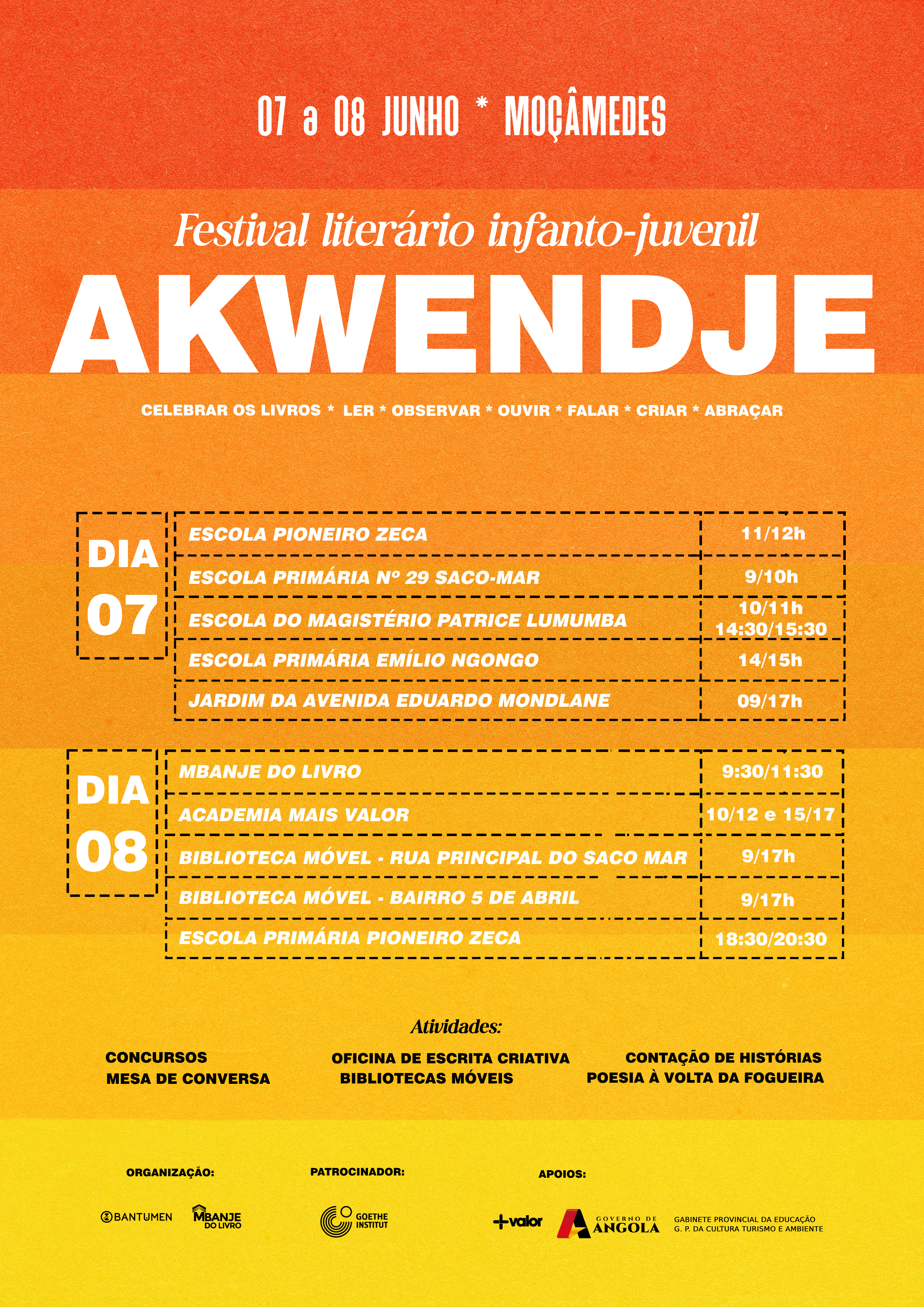 Nos dias 7 e 8 de junho, a BANTUMEN e os coletivos BISO e MBANJE DO LIVRO vão percorrer as escolas da cidade de Moçâmedes, no Namibe (Sul de Angola), com um festival especial: o Akwendje.