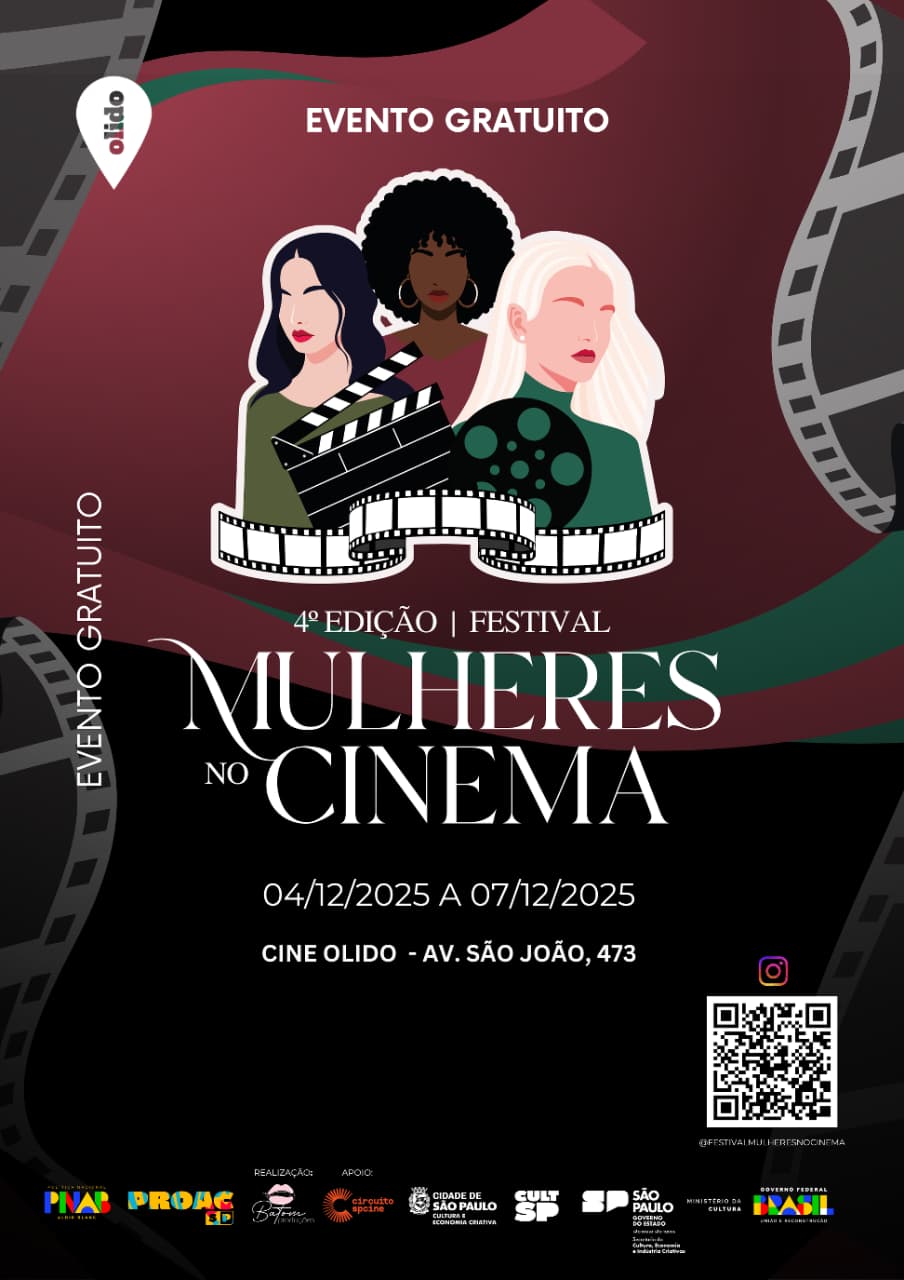 O Festival Mulheres no Cinema chega à sua 4.ª edição entre 4 e 7 de dezembro de 2025, com data extra no dia 12, ocupando pela primeira vez o Cine Olido, no centro de São Paulo, com uma programação totalmente gratuita dedicada ao audiovisual realizado por mulheres cis e trans. Criado em 2019 pela Batom Produções, o evento afirma-se como um espaço de encontro, difusão e visibilidade para o curta-metragem independente feito por realizadoras de diferentes regiões do Brasil.