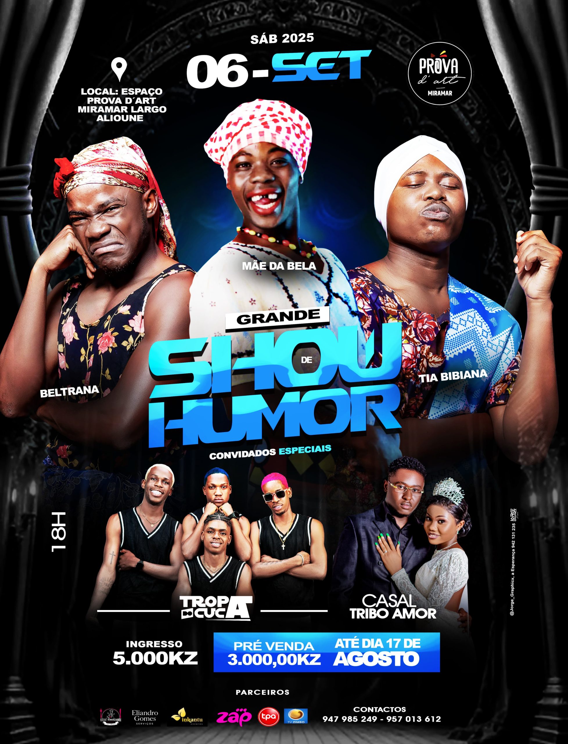 No dia 6 de setembro de 2025, o Espaço Prova D’Art, no Miramar – Largo Alioune, recebe o Grande Show de Humor, um espetáculo que promete arrancar gargalhadas do público com algumas das figuras mais irreverentes da comédia angolana.