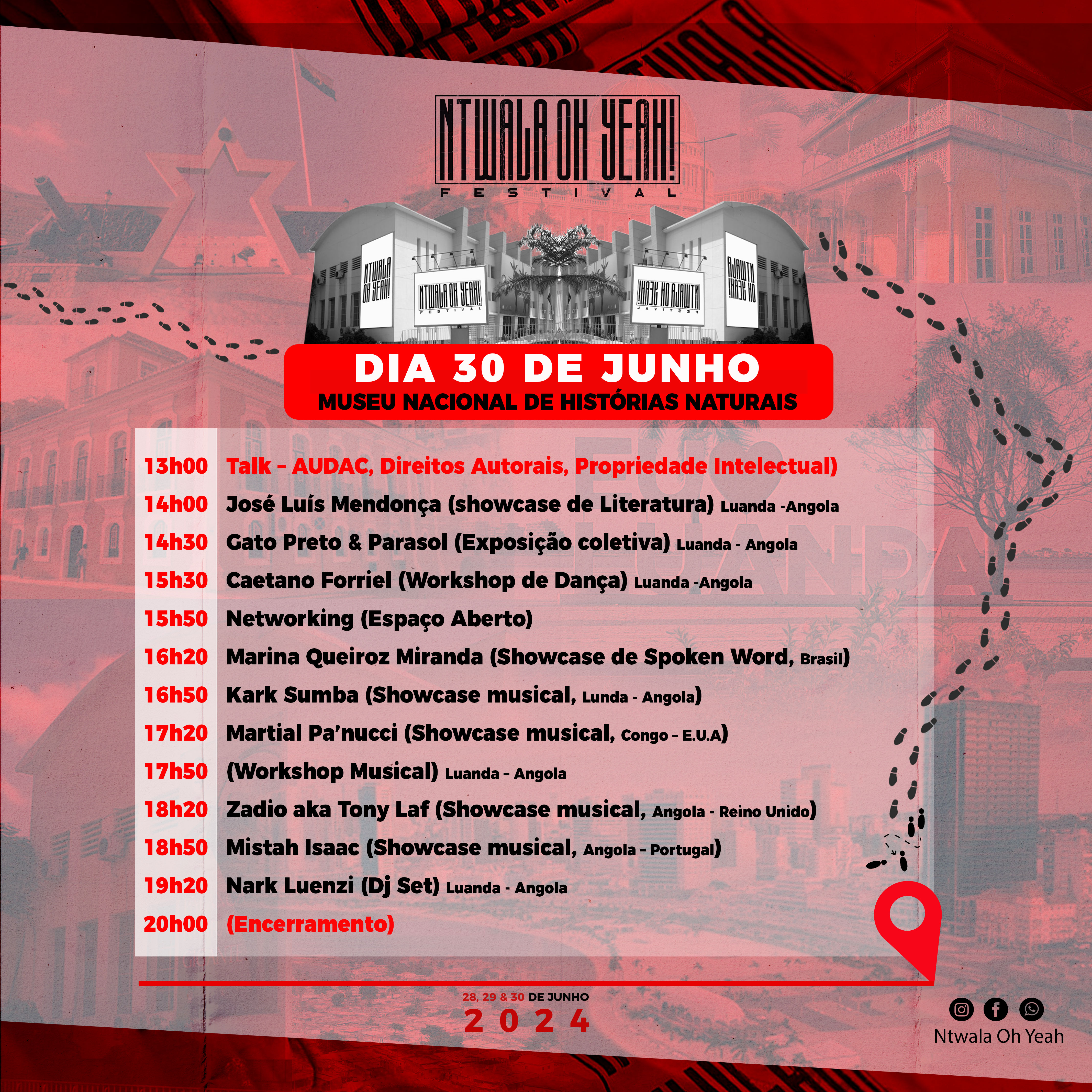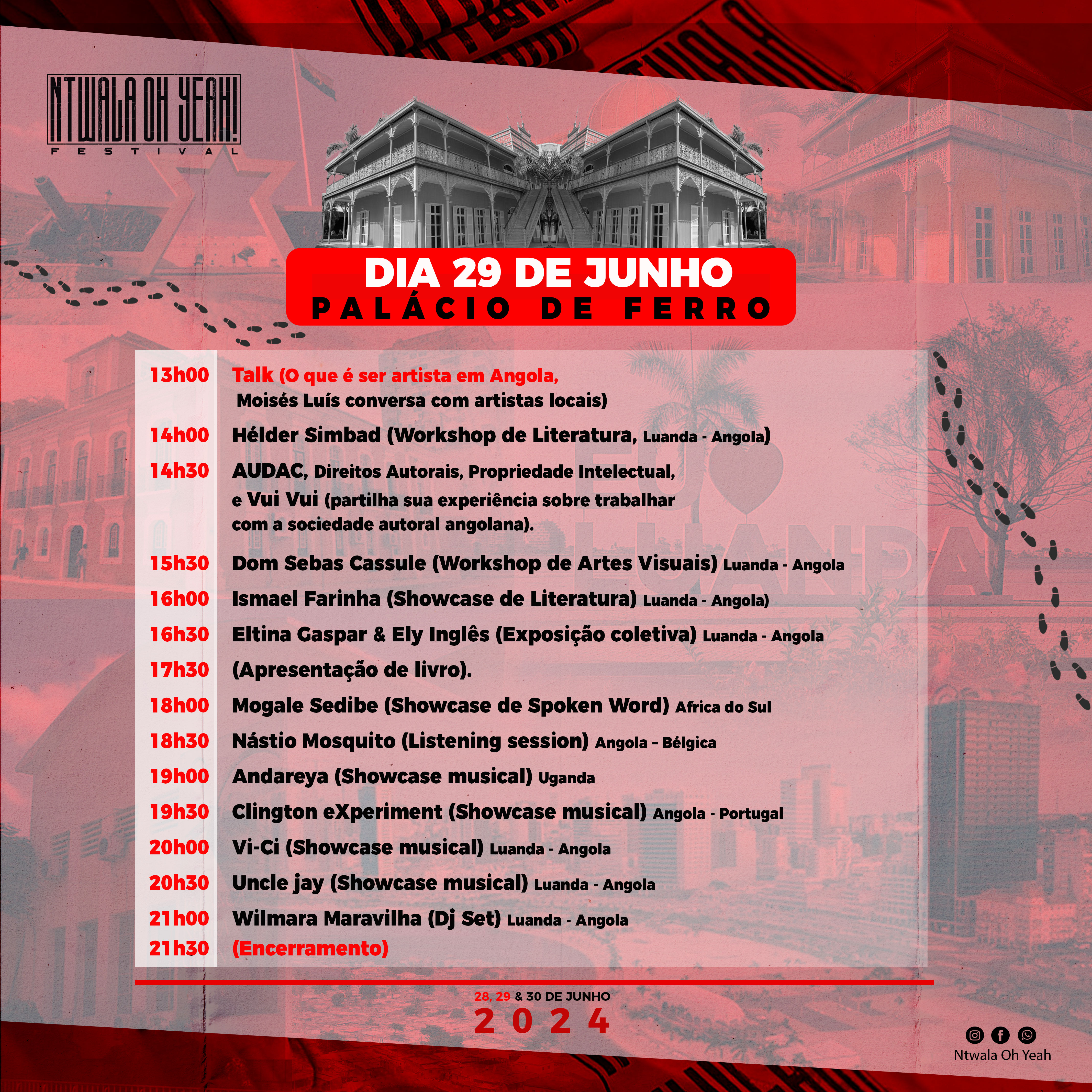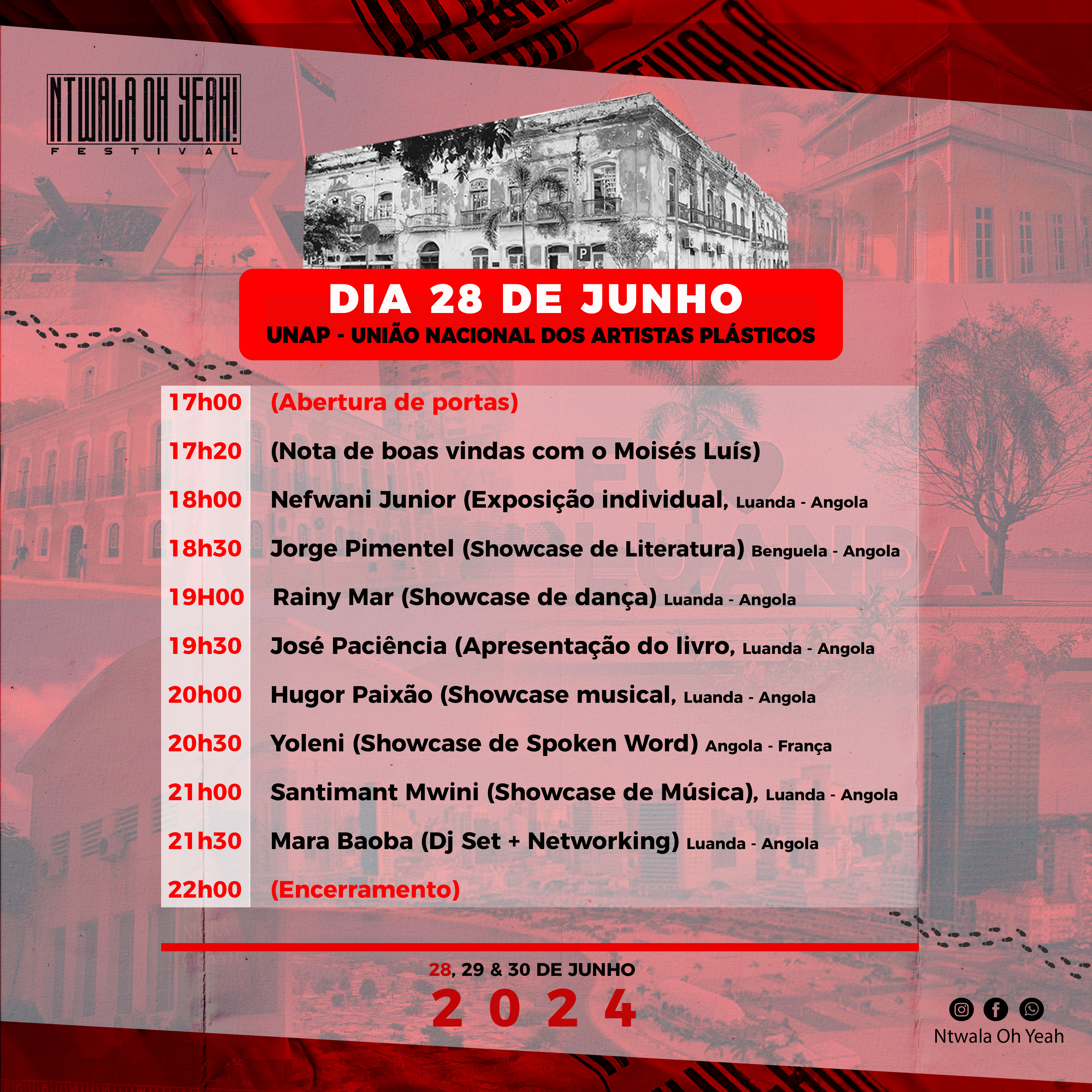 Entre música, dança, literatura, artes visuais e spoken word, são 17 artistas selecionados para showcases, dentre eles o Andereya Baguma (Uganda) Mogale Sedibe (África do Sul),Marina Queiroz Miranda (Brasil), Martial PA’NUCCI (Congo), Mistah Isaac (Angola - Portugal, Clington eXperiment (Angola - Portugal), Zadio aka Tony Laf (Angola - Reino Unido), Yoleni (Angola - França), VI-CI Luanda - Angola, Rainy Mar (Luanda - Angola). Kark Sumba (Luanda - Angola), Uncle Jay (Luanda - Angola) Hugor Paixão (Luanda - Angola) Santimant Mwiny (Luanda – Angola), José Luís Mendonça (Luanda -Angola), Jorge Pimentel (Benguela - Angola) Ismael Farinha (Luanda Angola). 5 para exposições, Ely Inglês ( Luanda - Angola), Gato Preto (Luanda - Angola) Eltina Gaspar (Luanda -Angola) Nefwani Júnior (Luanda -Angola), Parasol (Luanda - Angola), Nástio mosquito (Angola - Bélgica) para Listening Session. 3 selectas, Nark Luenzi (Luanda -Angola), Wilmara Maravilha (Luanda - Angola, e Mara Baoba. 4 oradores, Hélder Simbad, Caetano Forriel, Don Sebas Cassule e Pedro Bélgio, 1 escritor a fazer pré-lançamento de livro, José Paciência, e 1 Orador de talk, OG Vuino.